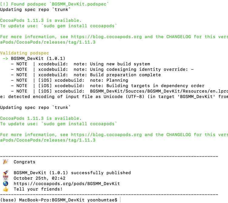 이제 CocoaPods 서버로 라이브러리를 업로드합니다. 터미널에 아래 명령어를 입력합니다.