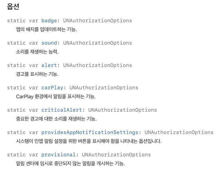 requestAuthorization(options:completionHandler:)에 전달하는 options에는 UNAuthorizationOptions의 모든 조합이 포함될 수 있습니다.