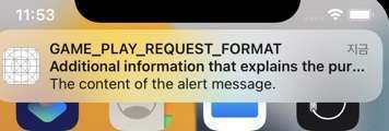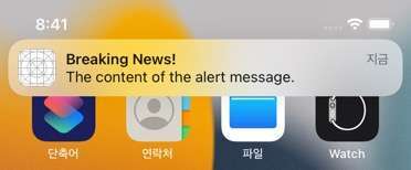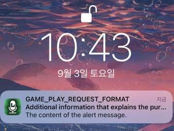 위 스크린샷은 로컬 노티피케이션의 예제로 제목과, 내용이 첨부되어 있습니다.