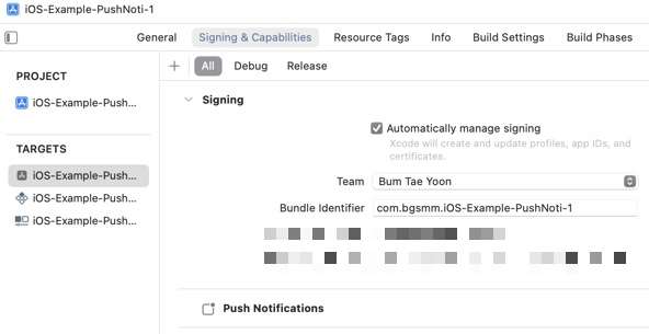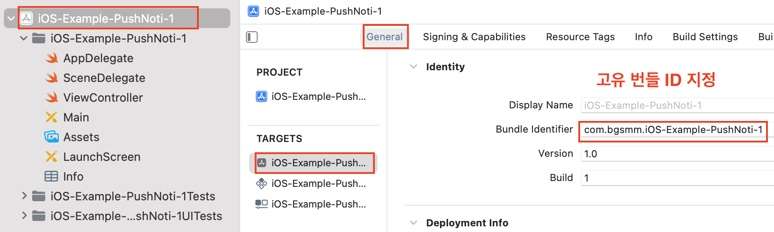 Xcode의 프로젝트 탐색기의 프로젝트 설정의 General 탭에서 번들 식별자를 고유값으로 변경하여 Apple의 푸시 알림 서버가 푸시를 이 앱으로 보낼 수 있도록 합니다.