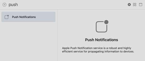 다음으로 개발자 계정에서 앱 ID를 생성하고 푸시 알림 자격을 활성화해야 합니다. Xcode에는 이를 수행하는 간단한 방법이 있습니다. 위의 창에서 Signing & Capabilities 탭을 클릭한 다음 + 버튼을 클릭합니다. 검색창에 “push”를 입력하고 Push Notifications를 선택합니다.