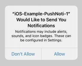 - 알림을 표시하기 위한 승인을 요청합니다. 전달된 옵션은 앱에서 사용하려는 알림 유형을 나타냅니다. 여기에서 알림(alert), 소리(sound) 및 배지(badge)를 요청합니다.