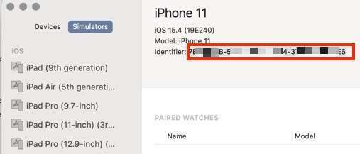 simctl을 사용하려면 앱을 실행하는 시뮬레이터의 장치 식별자(Identifier)를 알아야 합니다. 식별자를 얻으려면 Xcode에서 Windows ▸ Device and Simulators를 선택한 다음 상단의 Simulator 탭을 선택하고 왼쪽 목록에서 사용 중인 시뮬레이터를 선택합니다. 마우스를 사용하여 식별자를 복사합니다.