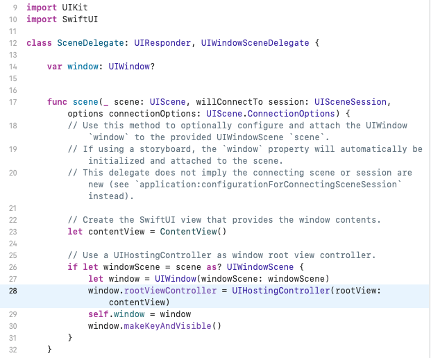 Swift UI에서 주요 내용은 ContentView.swift 에서 진행됩니다. 근거는 SceneDelegate.swift 에 있습니다.
