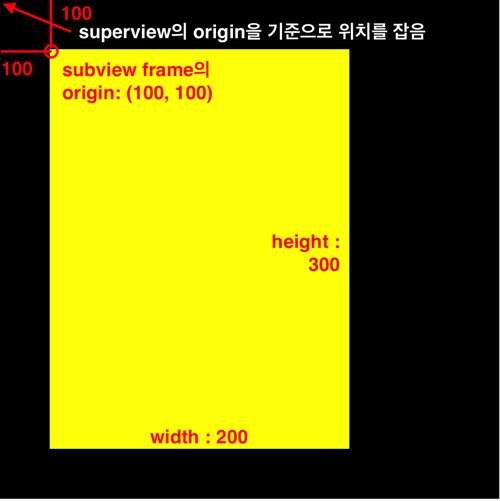 frame위치가x: 100, y: 100인 경우, superview의 시작점 위치로부터 해당 거리만큼 떨어진 곳에 위치하게 됩니다.