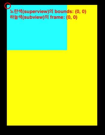 처음에는 bounds의 위치를 따로 지정하지 않았으므로 bounds.origin은 (0, 0)인 상태에서 하위뷰의 frame.origin도 (0, 0)이므로 두 뷰의 시작점은 똑같습니다.