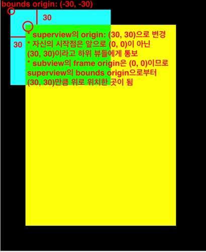 (x: 0, y: 0)으로 지정되며 이는 자신(뷰)가 표시(display)되는 시작점입니다.. bounds의origin를 변경하면- 자신의 위치는 변하지 않지만 이 뷰의 모든 하위 뷰의