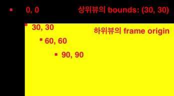 아래 그림은 상위뷰의 bounds가 (30, 30)인 상태에서 하위뷰의 frame 위치가 (0, 0), (30, 30), (60, 60), (90, 90)인 경우의 위치를 나타낸 그림입니다.