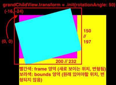 frame(bounds).size는(0, 0, 200, 150)frame은 변형된 위치와 크기로 재계산됩니다. 이 때, 위 그림의 빨간색 박스와 같이 회전되면서 남은 빈 영역까지 포함한 사각형CGRect로 표현됩니다.(말로 설명이 어렵네요;;) 따라서 새로운 위치는(-16, -24, 232, 197)로 바뀝니다.bounds는 변형되지 않았을 때 크기와 위치값을 그대로 가집니다. 따라서 위 그림의 보라색 부분이며(0, 0, 200, 150)으로 그대로입니다.