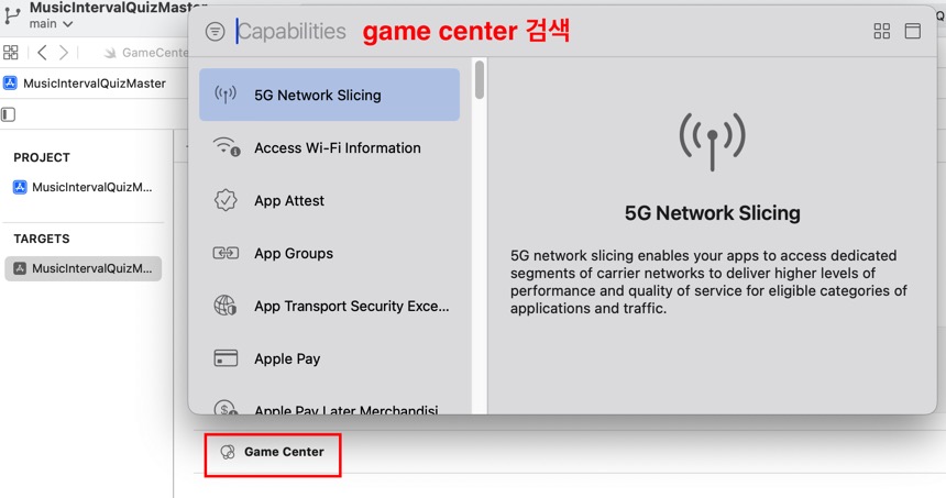 Signing & Capabilities탭에서+ Capability버튼을 클릭한 후Game Center를 추가합니다. - Game Center 설정 확인: