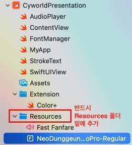 위 방법으로 생성된 Resources 파일 밑에 커스텀 폰트 파일을 드래그해서 추가합니다.