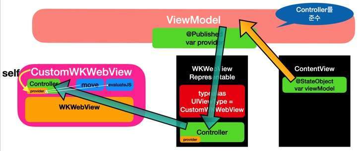 Provider를 가지고 있는Controller프로토콜을 작성합니다. ObservableObject와Controller를 내려받은 뷰모델 클래스를 생성합니다.- 뷰모델 안에는