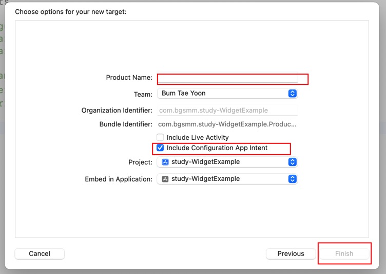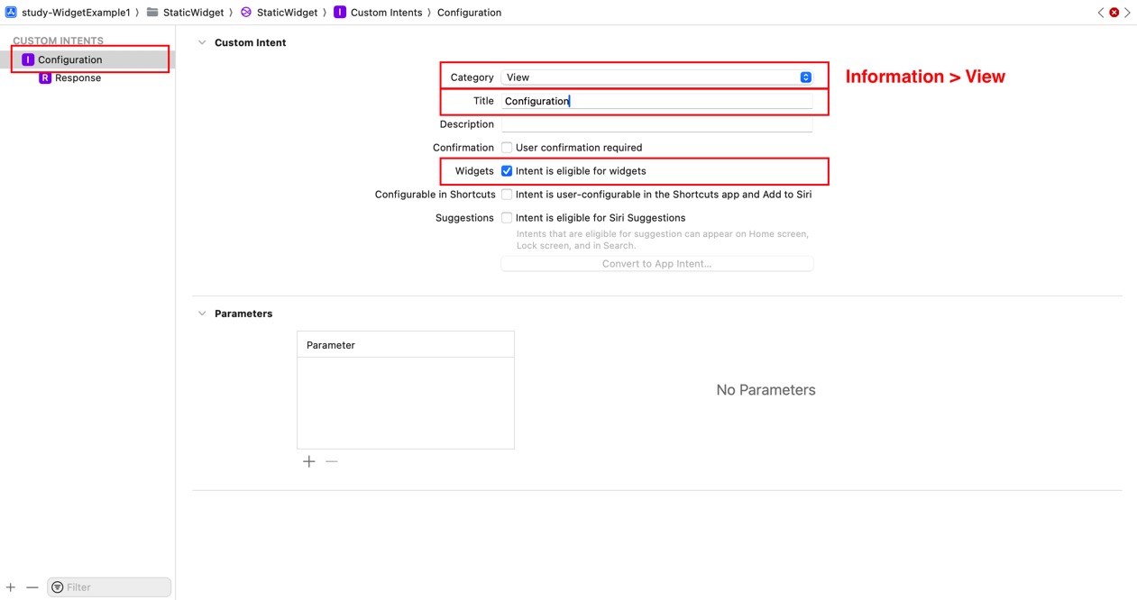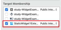 Intent 파일의 Target Membership에서 위젯 프로젝트를 체크합니다.
