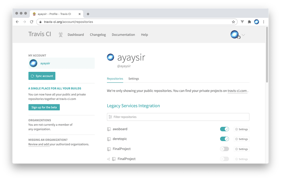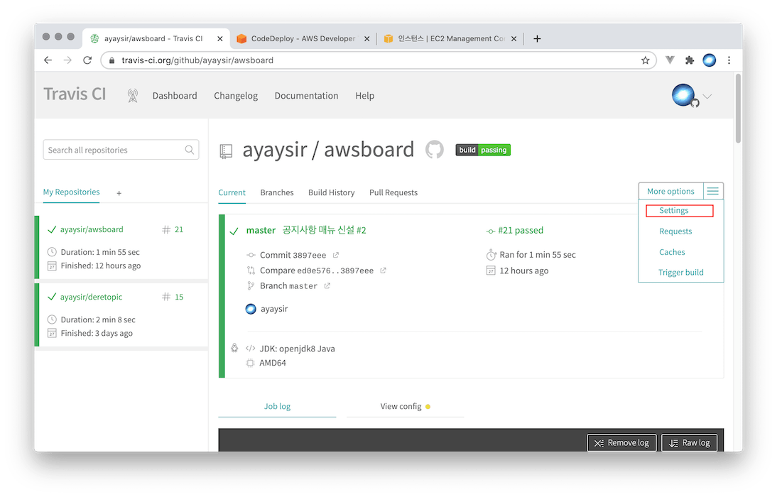 travis-ci.org에서 깃허브 아이디로 회원가입 및 로그인내 프로필 아이콘 > Settings에서 깃허브 레퍼지토리 추가- AWS에서 Travis-CI가 접근할 수 있는 사용자를