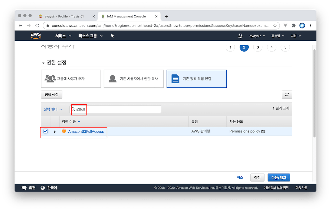 ![권한 설정에서 `[기존 정책 직접 연결]`을 선택하고 `[AmazonS3FullAccess]` 및,](/assets/img/wp-content/uploads/2020/07/screenshot-2020-07-21-pm-10.38.06.png)