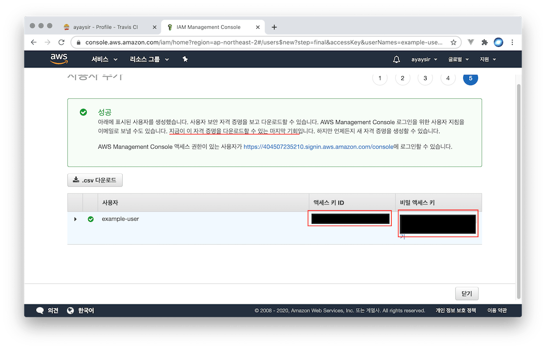 여기가 중요합니다. 액세스 키 ID, 비밀 액세스 키는 다시 찾기 어려우므로 여기서 미리 메모를 하거나 저장해야 합니다.
