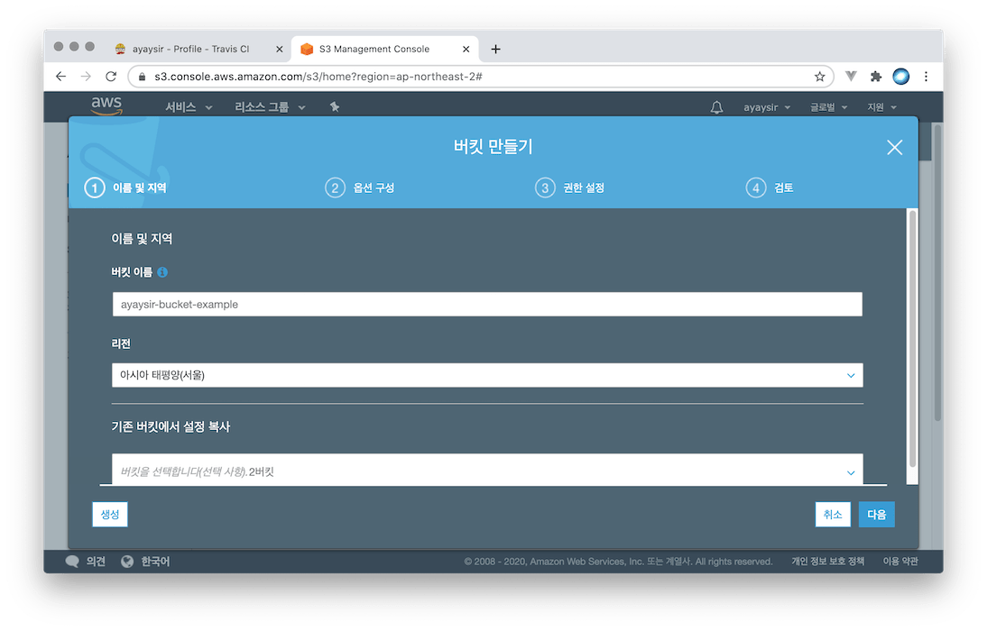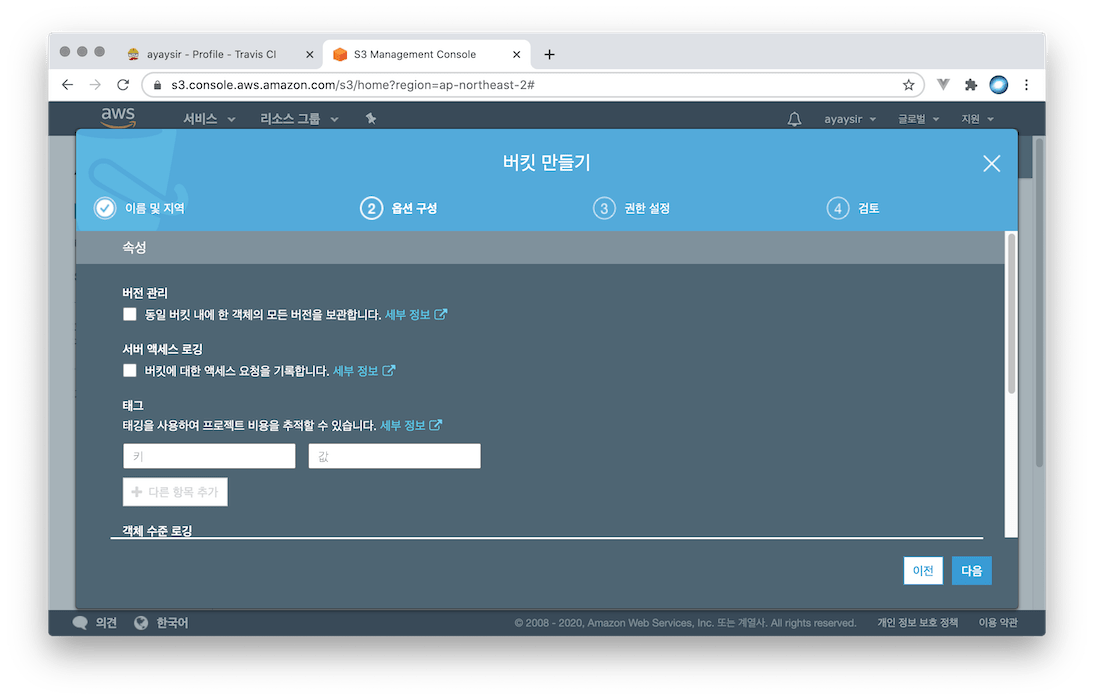 AWS S3은 파일을 저장할 수 있는 공간(버킷)을 제공하는 서비스입니다. 여기서 프로젝트 압축 zip을 Travis-CI와 AWS가 주고 받는 용도로 사용하기 위해 사용합니다.