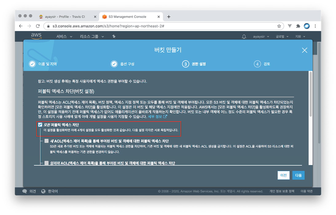 반드시 [모든 퍼블릭 액세스 차단]을 선택하고 버킷 생성