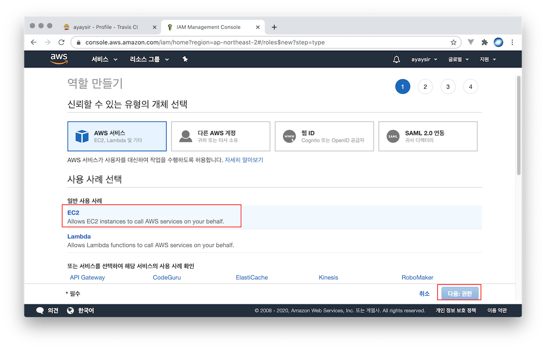 IAM 역할 생성하기를 다시 실행한 후 위 그림처럼 선택하고 다음으로 진행합니다.