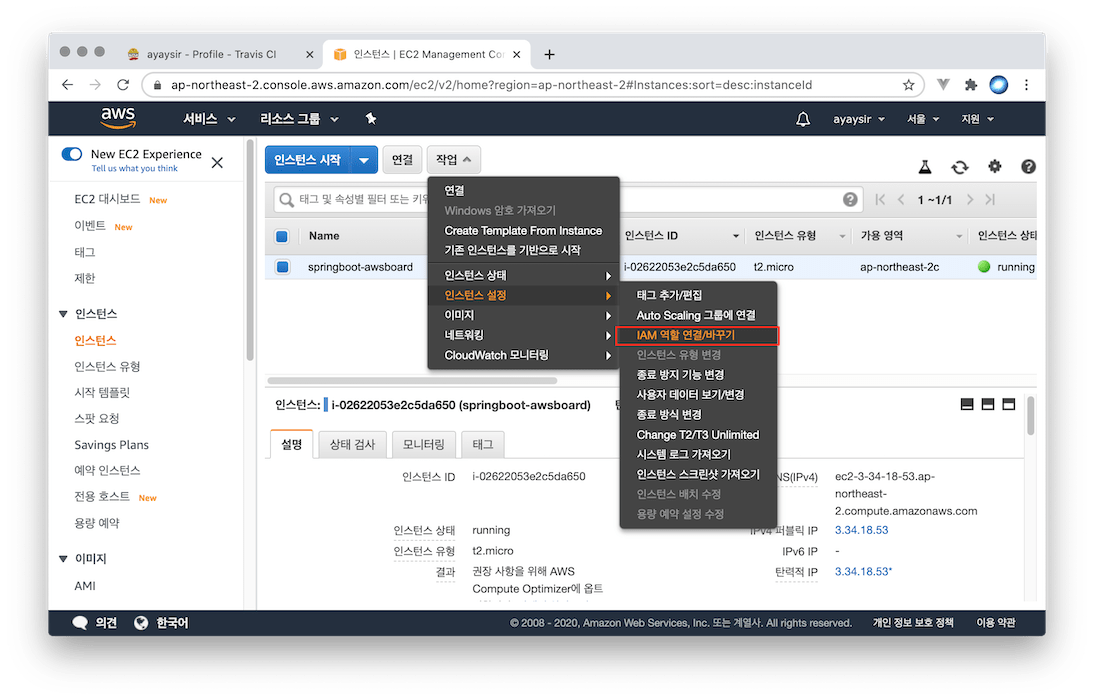 EC2 서비스 페이지로 가서 인스턴스 > 작업 > 인스턴스 실행 > [IAM 역할 연결바꾸기] 버튼을 클릭합니다.