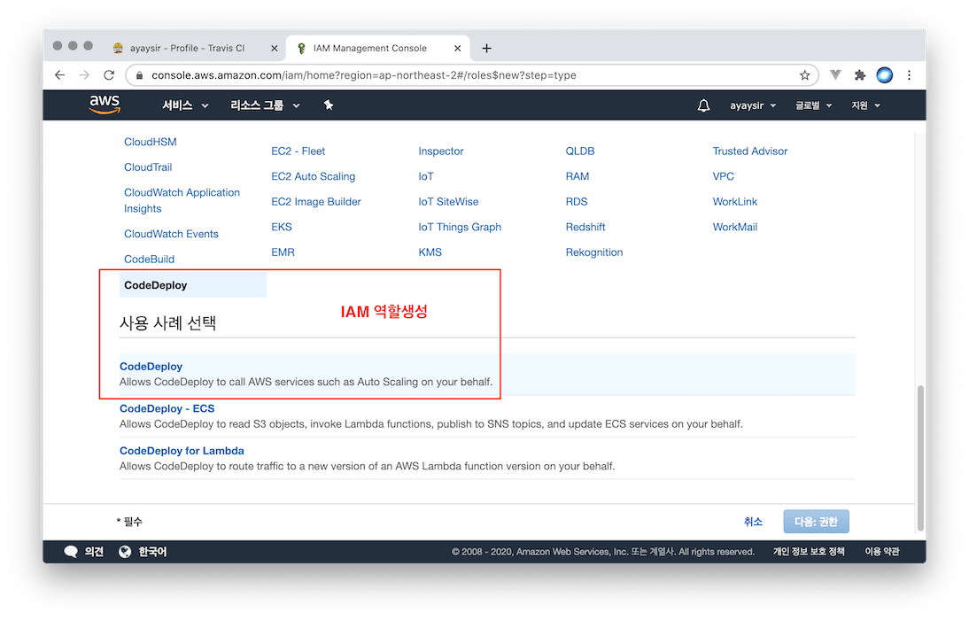 5. IAM에서 EC2에 연동되는 코드 디플로이 역할(Role) 생성 후 EC2에 연동