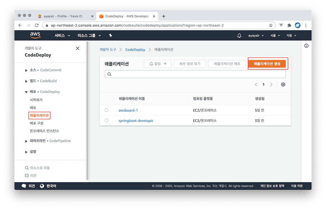 다음 CodeDeploy 페이지로 가서, [애플리케이션] 메뉴를 선택한 후 [애플리케이션 생성] 버튼을 클릭합니다.