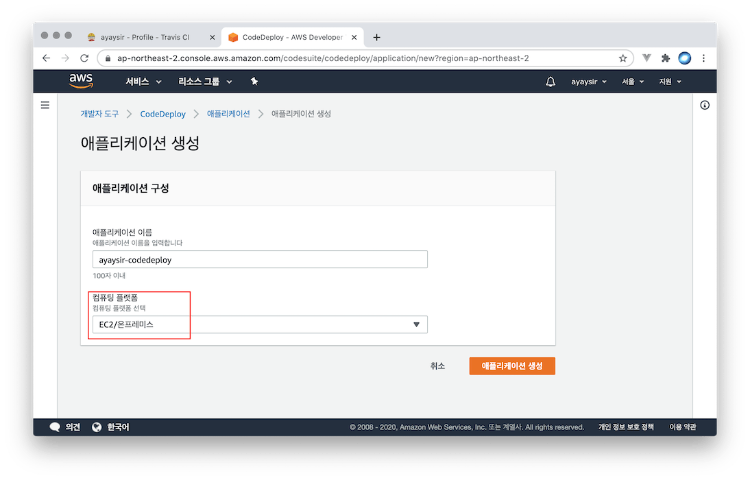 애플리케이션 이름을 입력하고, 컴퓨팅 플랫폼으로 [EC2/온프레미스]를 선택합니다.