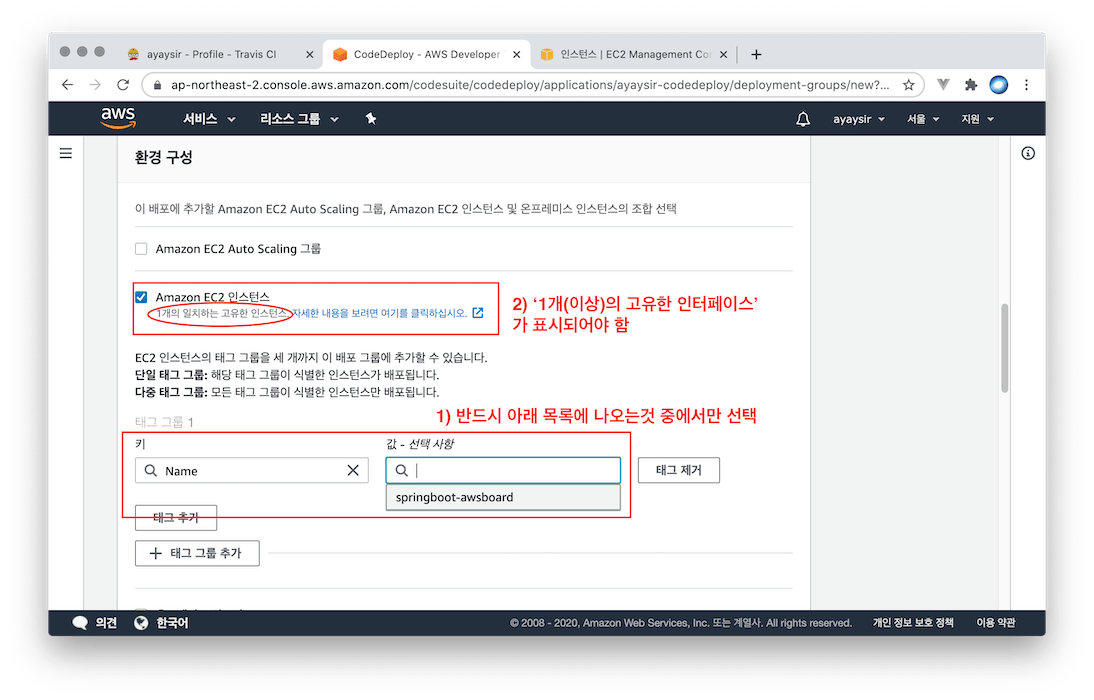 이 부분이 중요합니다. 여기서 환경 구성을 [Amazon EC2 인스턴스]를 선택한 후, 태그 그룹 부분을 위와 같이 입력합니다. 키를 Name으로 지정한 다음, 클릭하면 목록이 나오는데 현재 서비스중인 EC2 목록이 나옵니다. 이 목록 중에서 실제 빌드 및 배포가 진행될 EC2 인스턴스를 선택합니다.