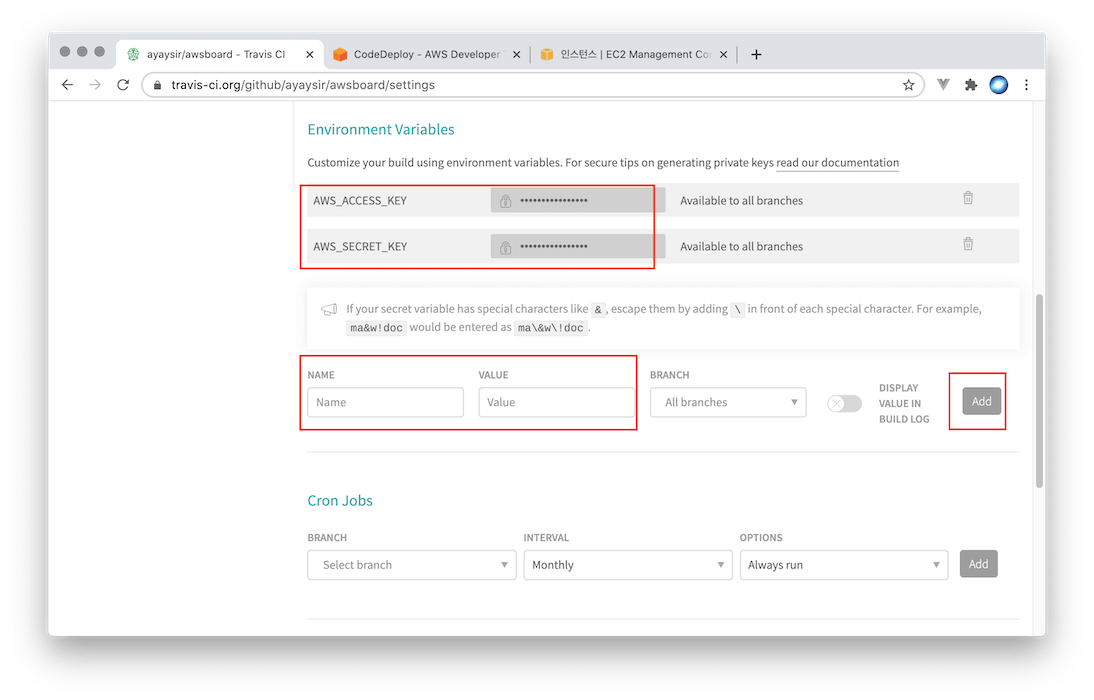 변수명으로 사용할 이름을 입력하고 위에서 발급받은 액세스 키, 비밀 키를 입력합니다. 이 변수들은 .travis.yml에서 $[변수명]으로 사용할 수 있습니다.