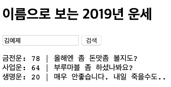 - 이름을 입력하면 이름을 변환한 해시값을 3등분하고 그 3등분한 부분을 금전운, 사업운, 생명운 수치로 환산해 수치와 해석을 화면에 뿌려주는 운세 예제입니다. 해시값은 원문과 1:1로 대응하므로 고유의 이름은 여러번 측정해도 동일한 수치가 나옵니다.
