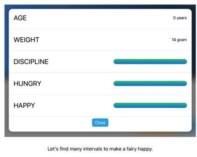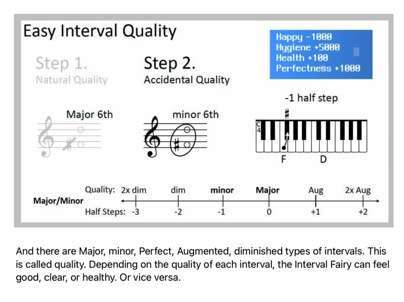 음악 이론 중 음정(interval)을 다마고치 형식을 통해 쉽고 재밌게(?) 배우게 하고자 하는 목적으로 제작하였습니다. 음정에는 성질(quality)라는 요소가 있는데, 장, 단, 완전, 증, 감 등이라는 이름으로 불림. 음정을 이루는 음 두 개를 피아노 건반을 이용해 입력하면 이러한 성질을 토대로 캐릭터(요정)을 행복하게 하거나, 위생 또는 건강을 증진시키거나 포만감을 채우게 할 수 있습니다.