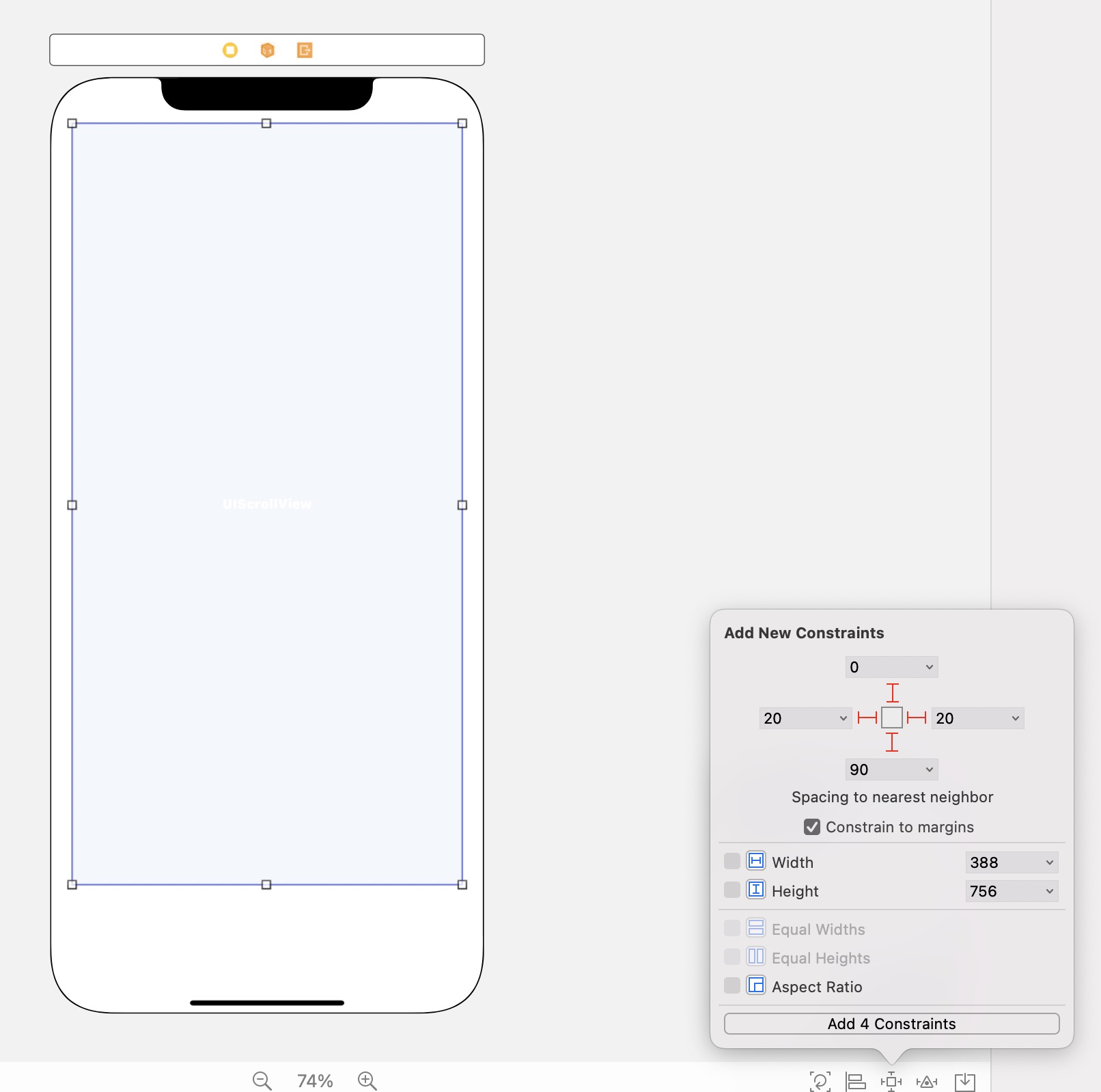 스크롤 뷰를 원하는 위치에 놓은 뒤 Add New Constraint로 상하좌우 제약(constraint)를 지정합니다. (빨간색 선 부분)