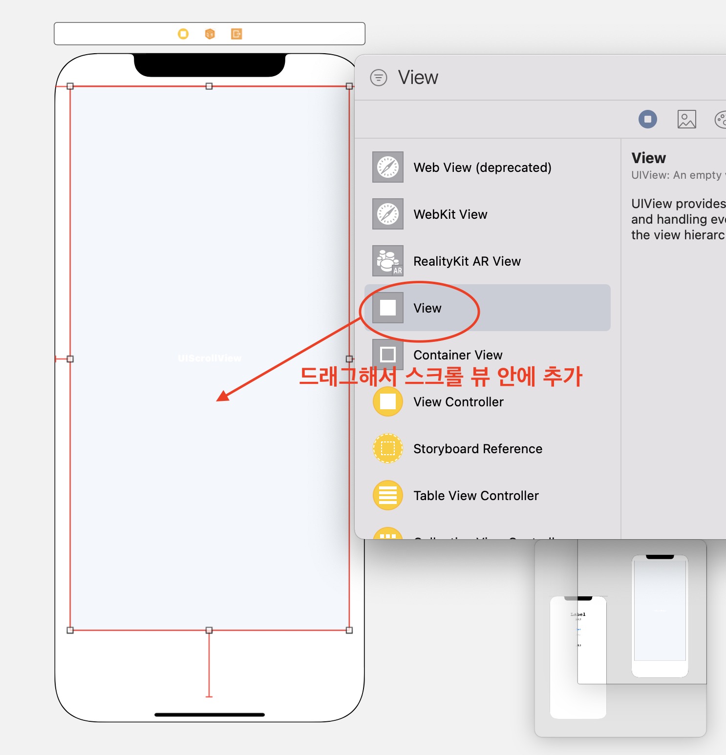스크롤 뷰 안에 일반 뷰(View)를 추가합니다. 뷰가 스크롤 뷰 안에 위치해야 합니다.