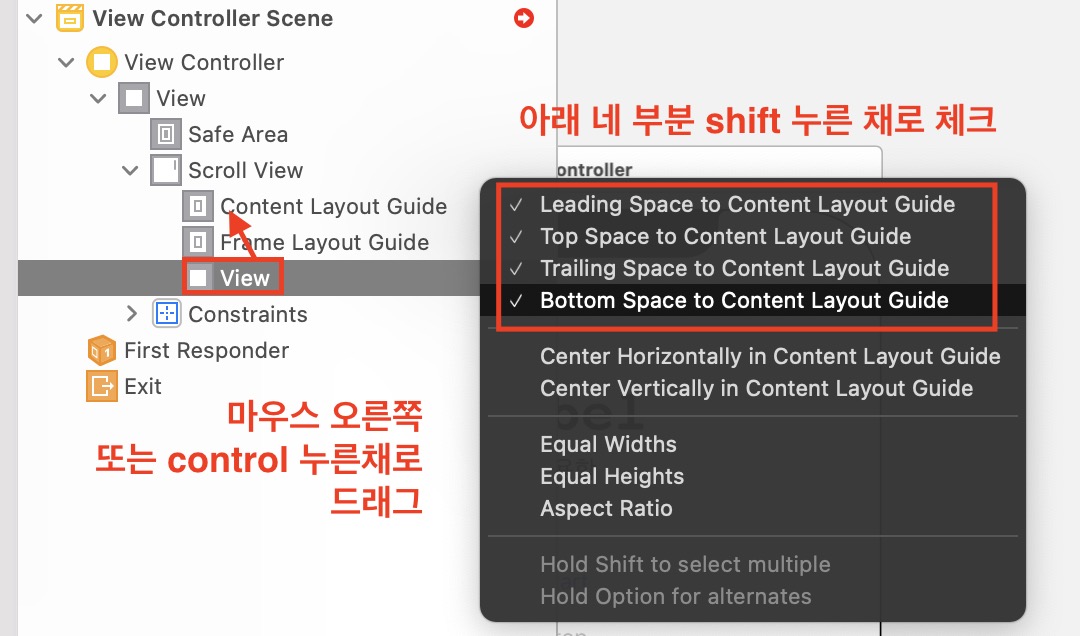 View의 상하좌우 여백을 Content Layout Guide에 제약을 지정합니다. Content Layout Guide는 컨텐츠 내용 영역을 의미합니다. 즉 어떠한 내용이 담겨있으며 분량이 얼마인지를 나타냅니다. View는 스크롤될 내용들이 담긴 뷰이므로 이것의 크기를 Content Layout Guide에 알려주는 것입니다.