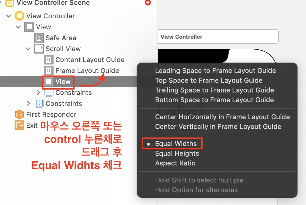 다음은 View와 Frame Layout Guide에 제약을 지정합니다. Frame Layout Guide는 고정되어야 하는 프레임을 의미합니다. 세로 스크롤인 경우 가로 길이는 고정되어 있고 세로 길이만 변합니다. 따라서 뷰의 가로 길이가 변하지 않아야 한다는 것입니다. Equal Width를 지정함으로써 가로는 고정시키고 세로는 스크롤되도록 합니다. 반대로 가로 스크롤인 경우 가로 길이가 변하고 세로 길이는 고정되어야 하므로 Equal Heights 를 지정합니다.
