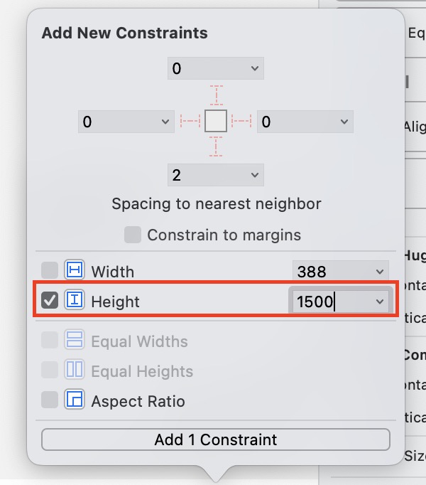 다음 View의 크기를 지정합니다. 세로 스크롤인 경우는 세로 길이가 유동적이므로 Height 제약을 지정하며 원하는 크기를 입력합니다. 반대로 가로 스크롤인 경우는 가로 길이가 유동적이므로 Width 제약을 지정합니다.
