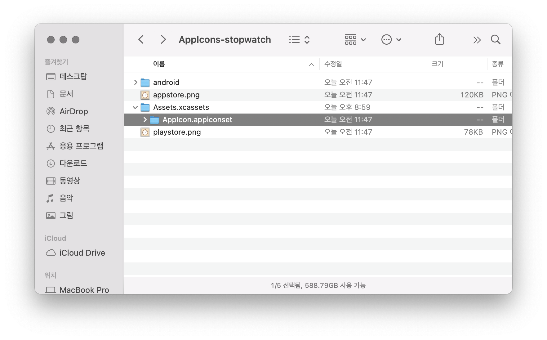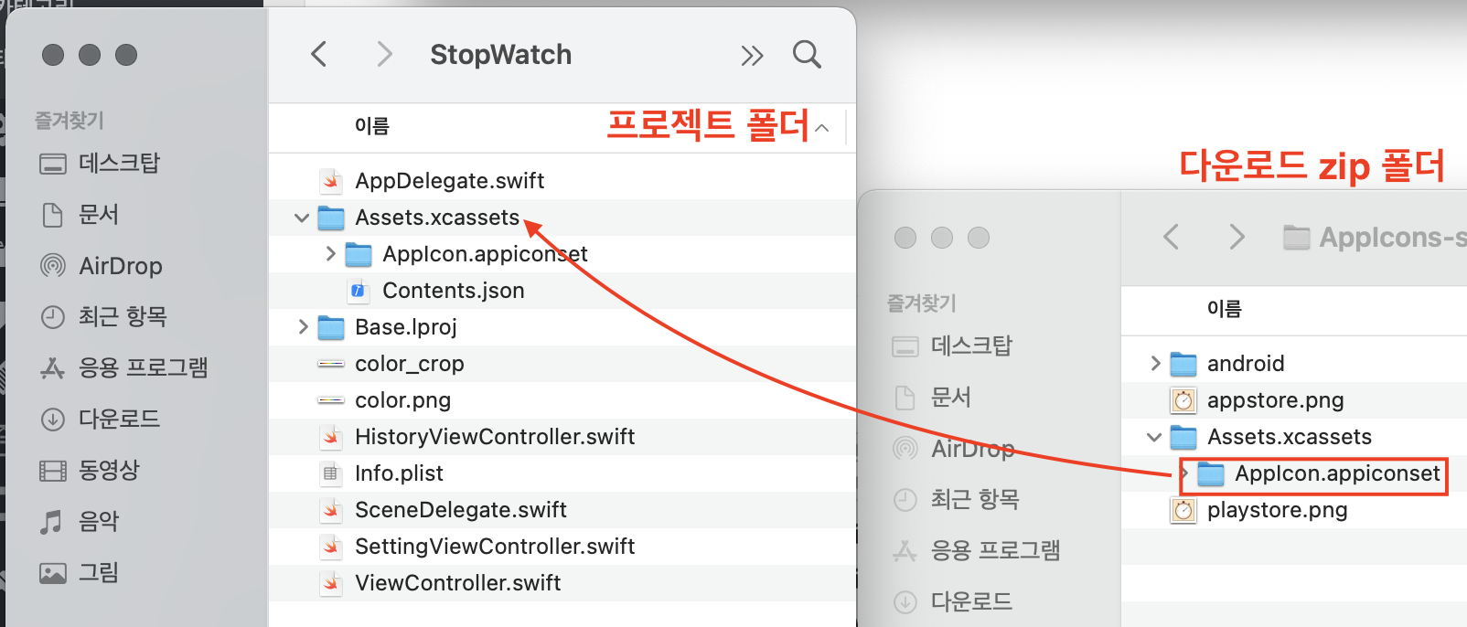 5) 그러면 프로젝트 폴더가 나타나는데 다운로드 폴더에 있는 AppIcon.appiconset 폴더를 프로젝트의 폴더로 옮깁니다.