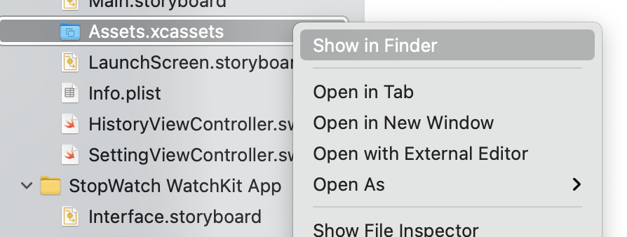 4) Xcode 앱 프로젝트에서 Assets.xcassets 폴더를 마우스 오른쪽으로 클릭한 뒤 [Show in Finder] 메뉴를 클릭합니다.