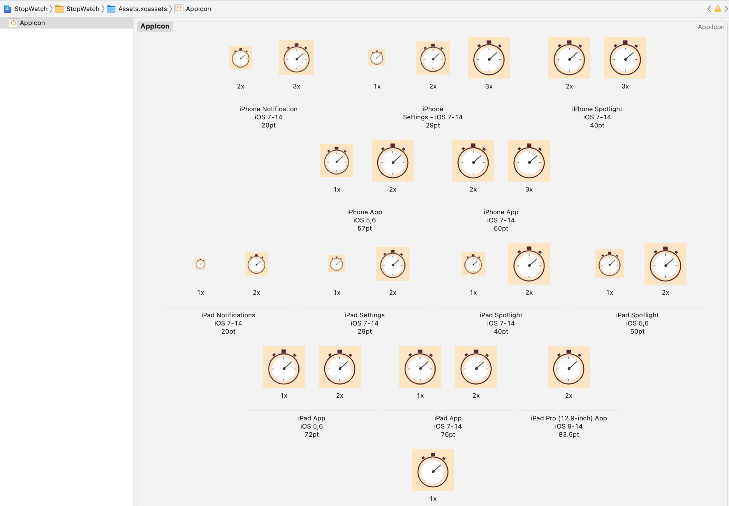 6) Xcode 프로젝트에서 asset 목록을 확인하면 아이콘들이 모두 등록되어 있는 것을 볼 수 있습니다.
