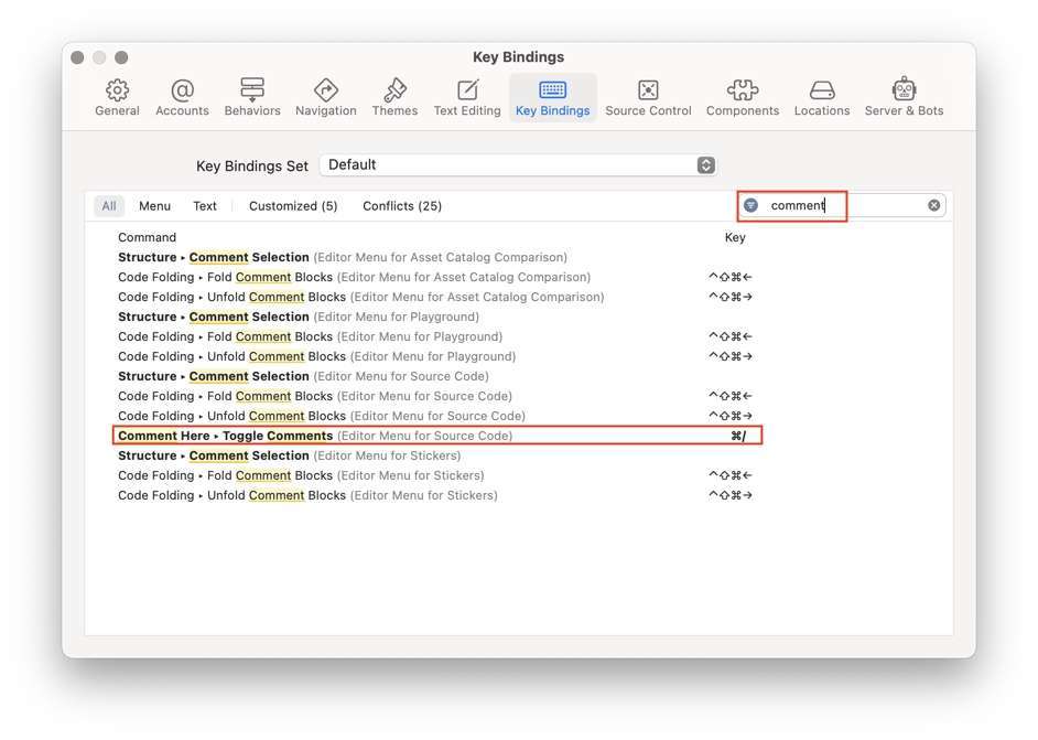 5. Xcode의 Preferences 창을 연 뒤, Key Binding 탭에서 comment로 검색 후, Comment Here > Toggle Comment 의 단축키를 command + / 로 설정합니다.